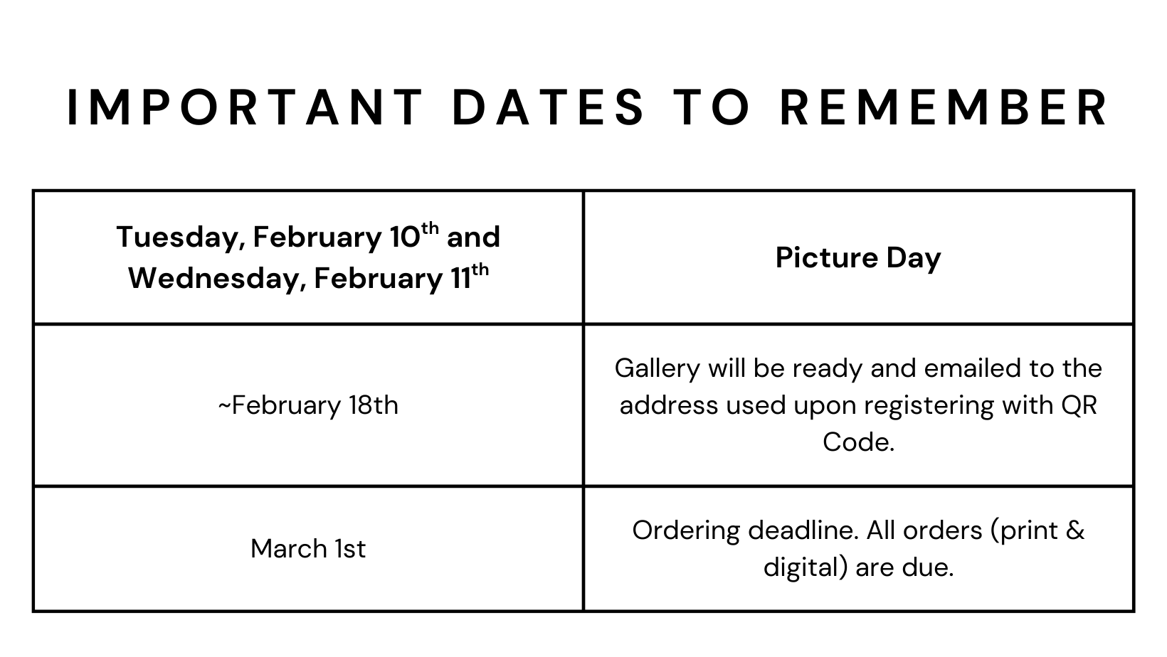 Picture days are Tuesday, February 10th & Wednesday, February 11th.