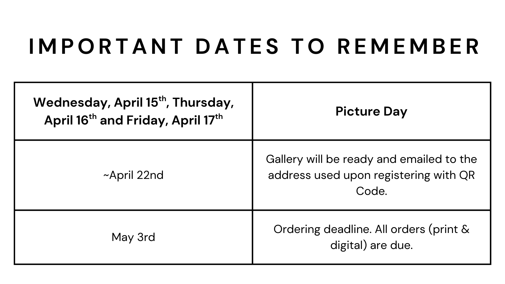 Picture days are Wednesday, April 15th, Thursday, April 16th & Friday, April 17th.