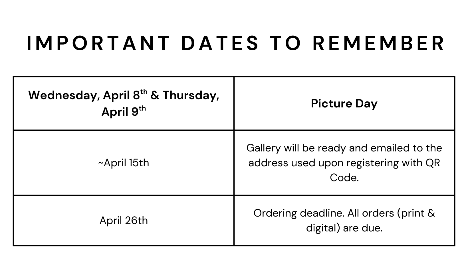 Picture days are Wednesday, April 8th & Thursday, April 9th.