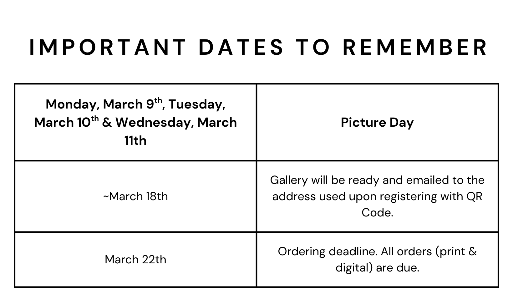Picture days are Monday, March 9th, Tuesday, March 10th & Wednesday, March 11th.